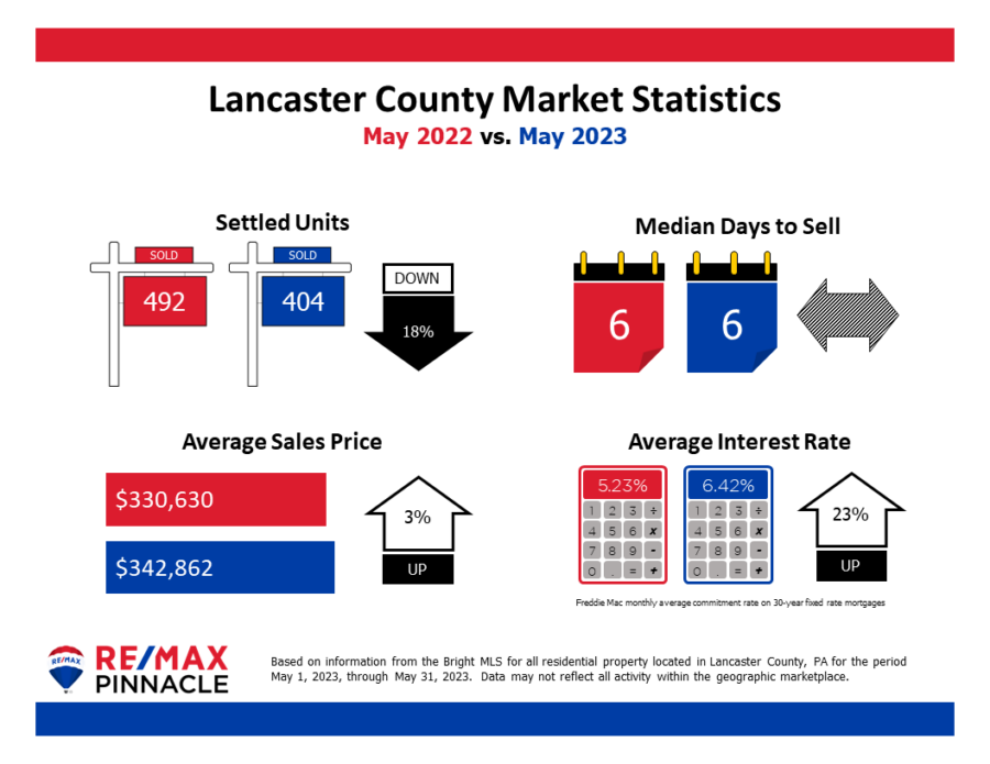 May looked very similar to April. Strong buyer activity, interest rates in the low 6’s and low inventory. It’s the low inventory that is the driver of the stats below. The number of settled properties (down 18% from this time last year) would be much, much higher if there more homes available. Because of the low inventory, multiple offers is still the norm, allowing appreciation to continue. If you are thinking about buying and/or selling a home in Lancaster County I am happy to talk with you about how the current market conditions should help guide your decisions.