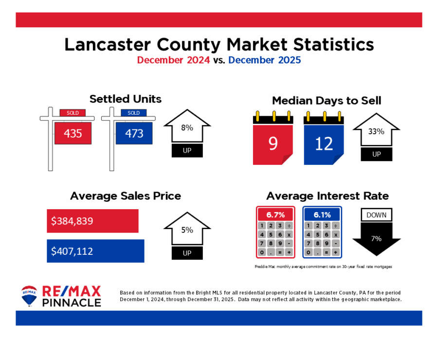 December wrapped up the year with strong sales activity, rising prices, and improving interest rates — even as the market naturally slowed with the holidays. The data points to a resilient Lancaster County market heading into 2026.