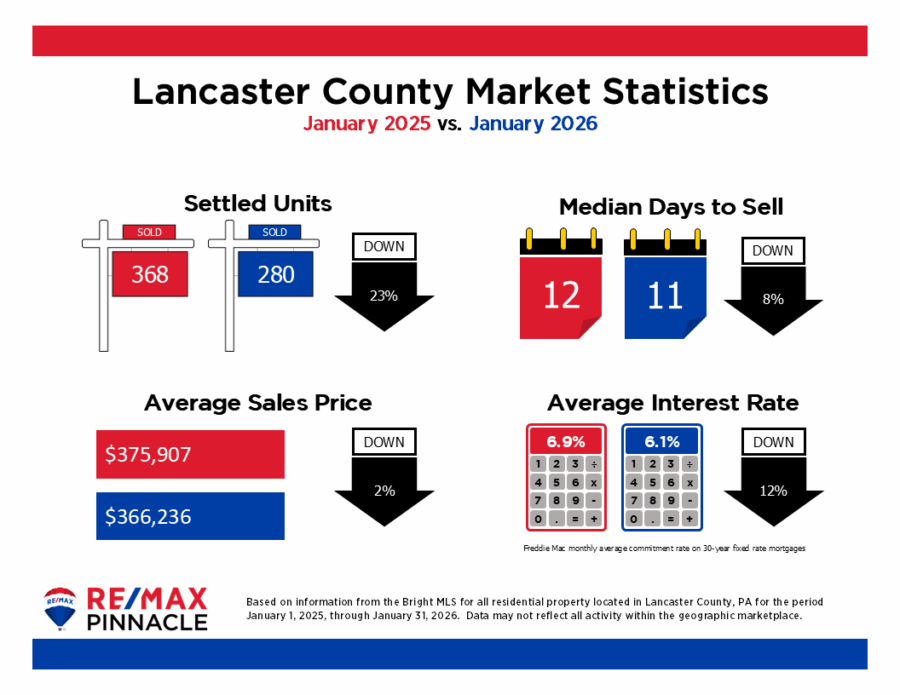 The new year is off to a slower start in Lancaster County (can you say Artic Freeze?), with fewer homes selling and slightly lower prices. However, improved interest rates and faster market times suggest opportunity for both buyers and sellers as we move toward the spring market.